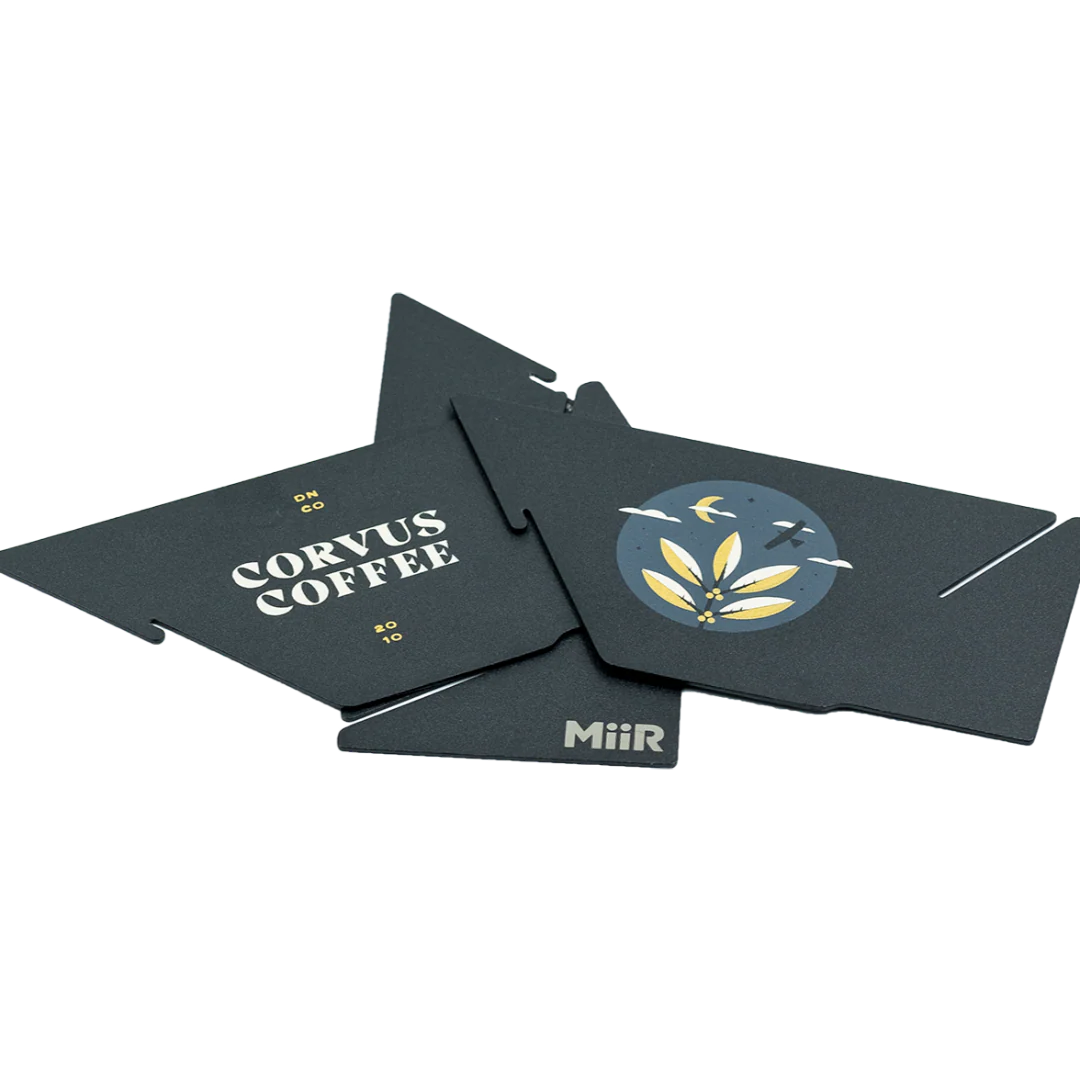MiiR's pourigami has become one of our favorite sourcing brewers - traveling light is key when buying coffee, and this folds down to the size of a long credit card. It pops together easily and cleans up nicely. Features a graphic interpretation of our word mark on one plate, and a coffee plant on another plate. Comes with case.